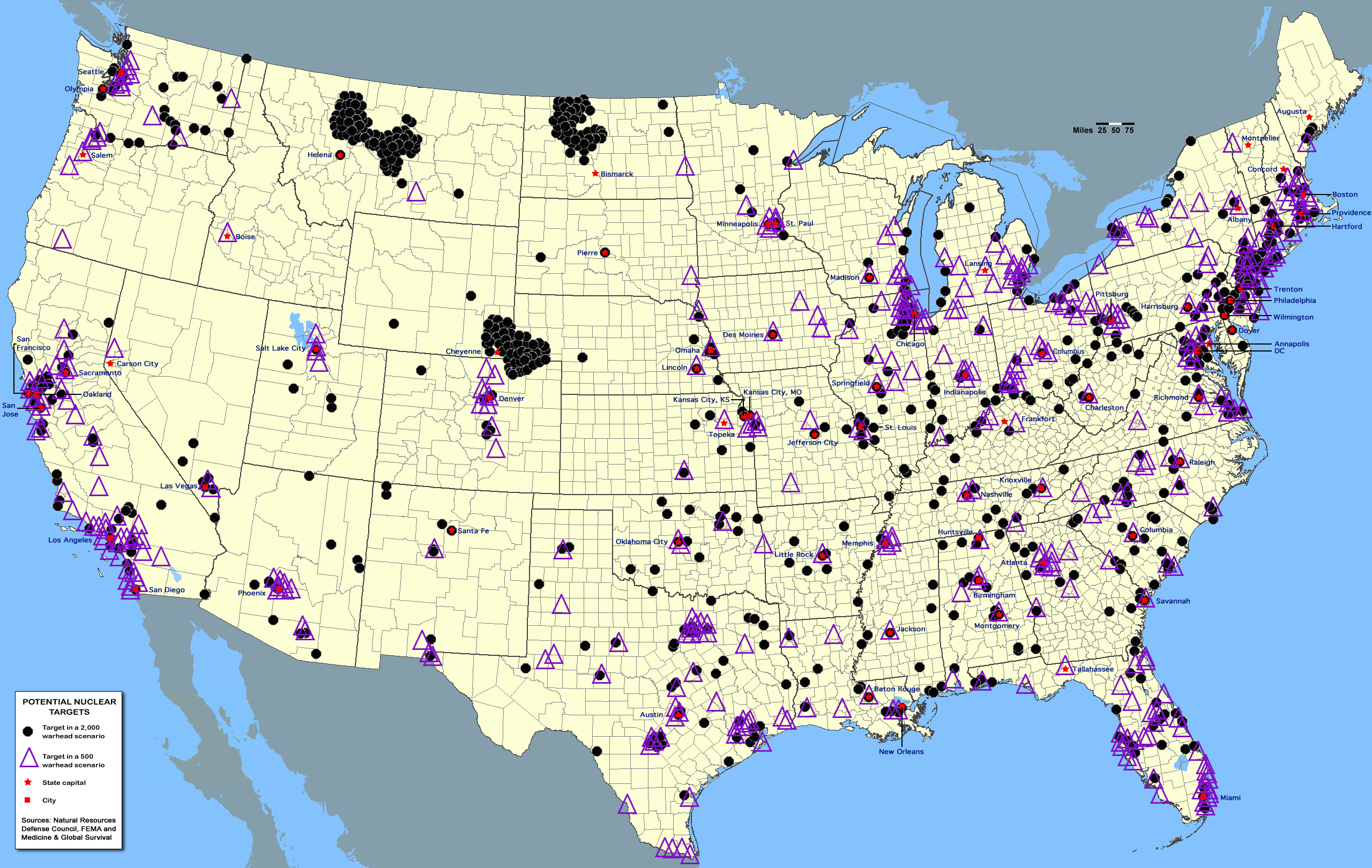 In the event of a nuclear war many of these cities have been mapped as potential Nuclear Targets due to being economic centers, tourism, military, local governments Eco hubs etc.. Click on the map to see your town enlarged. Hard to believe is it not? The town that I reside in is not that large in size however it is marked.