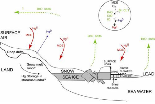 Photochemical reactions during the Arctic spring (Figure 1) combine salts from sea ice and the gaseous mercury in the air to create an oxidized reactive form of mercury. This mercury is then deposited to snow and ice. These deposition events require salty sea ice and snow crystal surfaces so they are widespread in the Polar Regions.