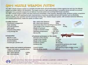 China is developing knock-offs of Russian-designed man-portable air defense missiles (manpads), including the QW-1 and later series models. The QW-1 Vanguard is an all-aspect, 35-lb. launch tube and missile that is reverse-engineered from the U.S. Stinger and the SA-16 Gimlet (9K310 Igla-1). China obtained SA-16s from Unita rebels in then-Zaire who had captured them from Angolan government forces. The 16g missiles have a slant range of 50,000 ft. The QW-1M is a variant that incorporates even more advanced SA-18 Grouse (9K38 Igla) technology.