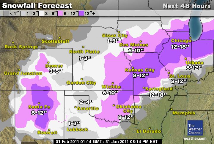What: A significant winter storm will emerge from the Rockies and blast parts of the Plains and Midwest with heavy snow and strong winds creating blizzard conditions at times. When: Monday Evening (January 31) through midday Wednesday (February 2). Peak impacts felt Tuesday. Cities Potentially Impacted (not all will experience blizzard conditions): Denver | Amarillo | Oklahoma City | Wichita | Kansas City | St. Louis | Tulsa | Chicago | Milwaukee | Detroit Impacts: Heavy snow will be accompanied by high winds making for life-threatening conditions if not properly prepared. Travel will become impossible at times on local roadways and interstates. Snow drifts will range between 4 and 8 feet in some locations. Visibility will be reduced considerably during the height of the snow and wind.