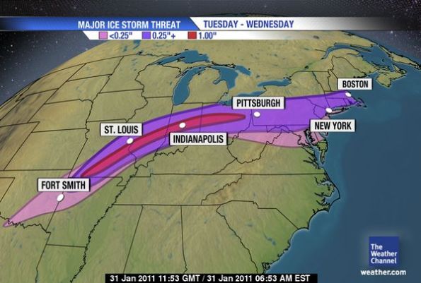 The weather system was expected to bring ice storms Monday night through early Wednesday to a region stretching from the Ozarks in Missouri and Arkansas across the Midwest and Ohio Valley and into New York, according to weather.com.