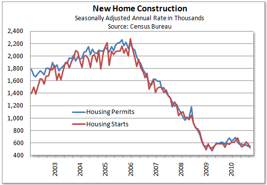 Private building of new homes dropped 4.3% in December from a month earlier to a seasonally adjusted annual rate of 529,000—the lowest level of housing starts since October 2009, the Commerce Department said Wednesday. The construction industry continued to stumble last year even as economic growth picked up and private-sector job creation returned. Housing starts ended the year 8.2% below December 2009 and there’s little sign building will pick up early this year.