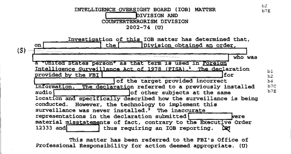 with the exception of one paragraph that notes the “scope of [the FBI agent’s] alleged offenses” warranted reporting to the IOB: the three pages detailing the offenses, however, are entirely redacted: