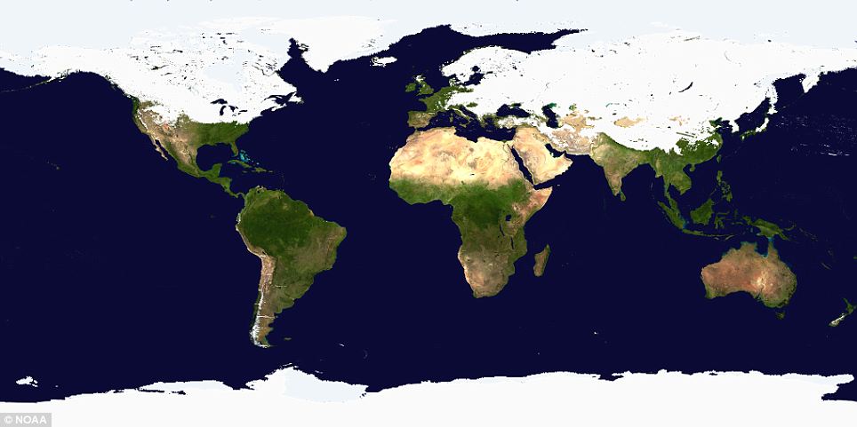 That Antarctica, the Arctic, Greenland and the frozen wastes of Siberia are covered in white comes as no surprise. But it is the extent to which the line dips down over the Northern Hemisphere that is so remarkable about the image.