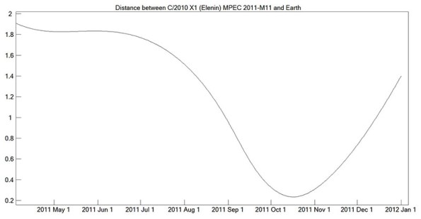L. Elenin / ISON-NM observatoryAt the end of June 2011, Comet Elenin will cross the orbit of the fourth planet of the Solar System – Mars. It must be noted that from April to June, the comet did not come closer to the Earth, but moved “parallel” with it. Right at the beginning of July, the comet will begin to very quickly move toward our planet. I again want to emphasize, the comet will pass 35 million kilometers from the Earth. It is an absolutely safe distance, just a little closer to the Earth than the second planet, Venus, comes.