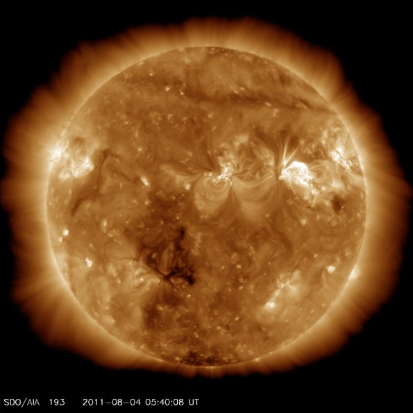 A solar wind stream flowing from the indicated coronal hole should reach Earth on Aug. 7th or 8th. Credit: SDO/AIA.