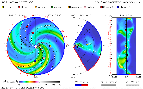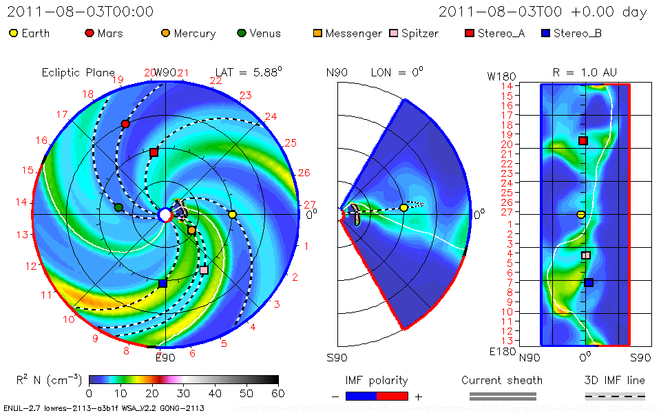 According to the model, Earth’s magnetic field will receive a double-strike from the clouds on August 4th at 22:39 UT plus minus 7 hours. Mild to moderate geomagnetic storms are possible when the CMEs arrive. Aurora alerts: text, voice.