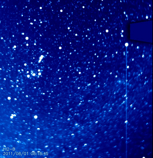 A few hours ago I got the first original comet images in FITS format, taken on August 1 (many thanks to Karl Battams, STEREO team member). Several frames was damaged, but the team believes that will solve this problem at the next session. I stacked all images by the comet movement, this has increase the singnal/noise ratio, see the comet with more “details”.