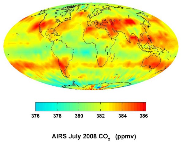 This image was created with data acquired by the Atmospheric Infrared Sounder, AIRS, during July 2008. The image shows large scale patterns of carbon dioxide concentrations that are transported around the Earth by the general circulation of the atmosphere