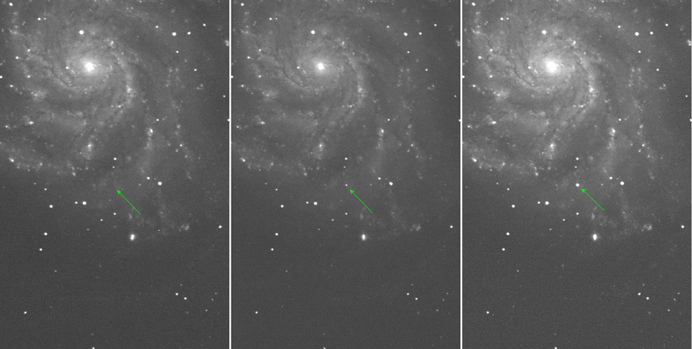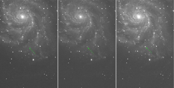 The arrow marks PTF 11kly in images taken on the Palomar 48-inch telescope over the nights of, from left to right, Aug. 22, 23 and 24. The supernova wasn't there Aug. 22, was discovered Aug. 23, and brightened considerably by Aug. 24. CREDIT: Peter Nugent and the Palomar Transient Factory