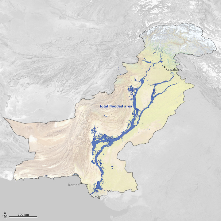 Floods covered at least 14,390 square miles (37,280 square km) of Pakistan between July 28 and September 16, 2010. For more information about this image, please visit this NASA Earth Observatory page Credit: NASA/Earth Observatory GREENBELT, Md. — Two of the most destructive natural disasters of 2010 were closely linked by a single meteorological event, even though they occurred 1,500 miles (2,414 km) apart and were of completely different natures, a new NASA study suggests.