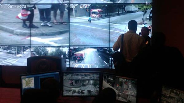 Monitors stretch from the floor to the ceiling. Police scan every movement on the street in what looks like a scene from a futuristic movie.