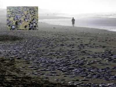 Moon jellyfish beach are stranding in San Francisco in November 2010. (Photo Credit: Ocean Beach Bulletin)