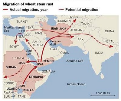 In some nations hit by the blight, wheat accounts for 50 percent of calorie intake, and 20 percent of protein nutrition.