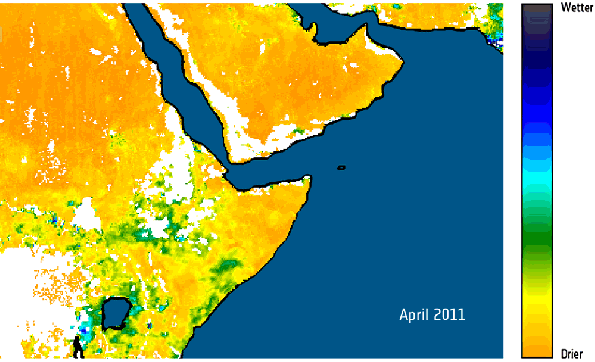 The animation, derived from SMOS satellite data, shows soil moisture in the Horn of Africa from April to mid-July 2011. The orange and yellow colouring depicts little to no moisture, while green and blue depict higher levels of soil moisture. Credits: CESBIO/ESA